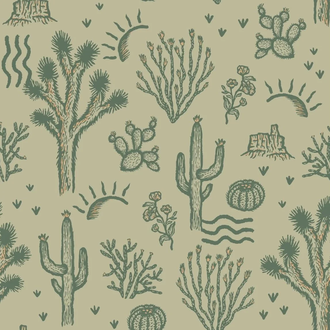 Pattern with cacti, desert plants, mountains, and sun illustrations in a muted green color scheme.